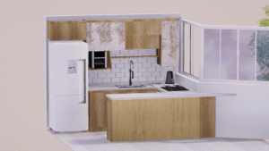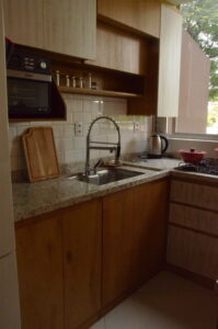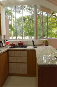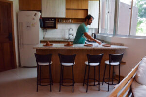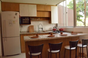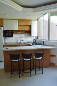A bancada americana recebeu uma abertura extra para o lado da sala proporcionando utilizar um espaço sem acesso pelo lado interno da cozinha.