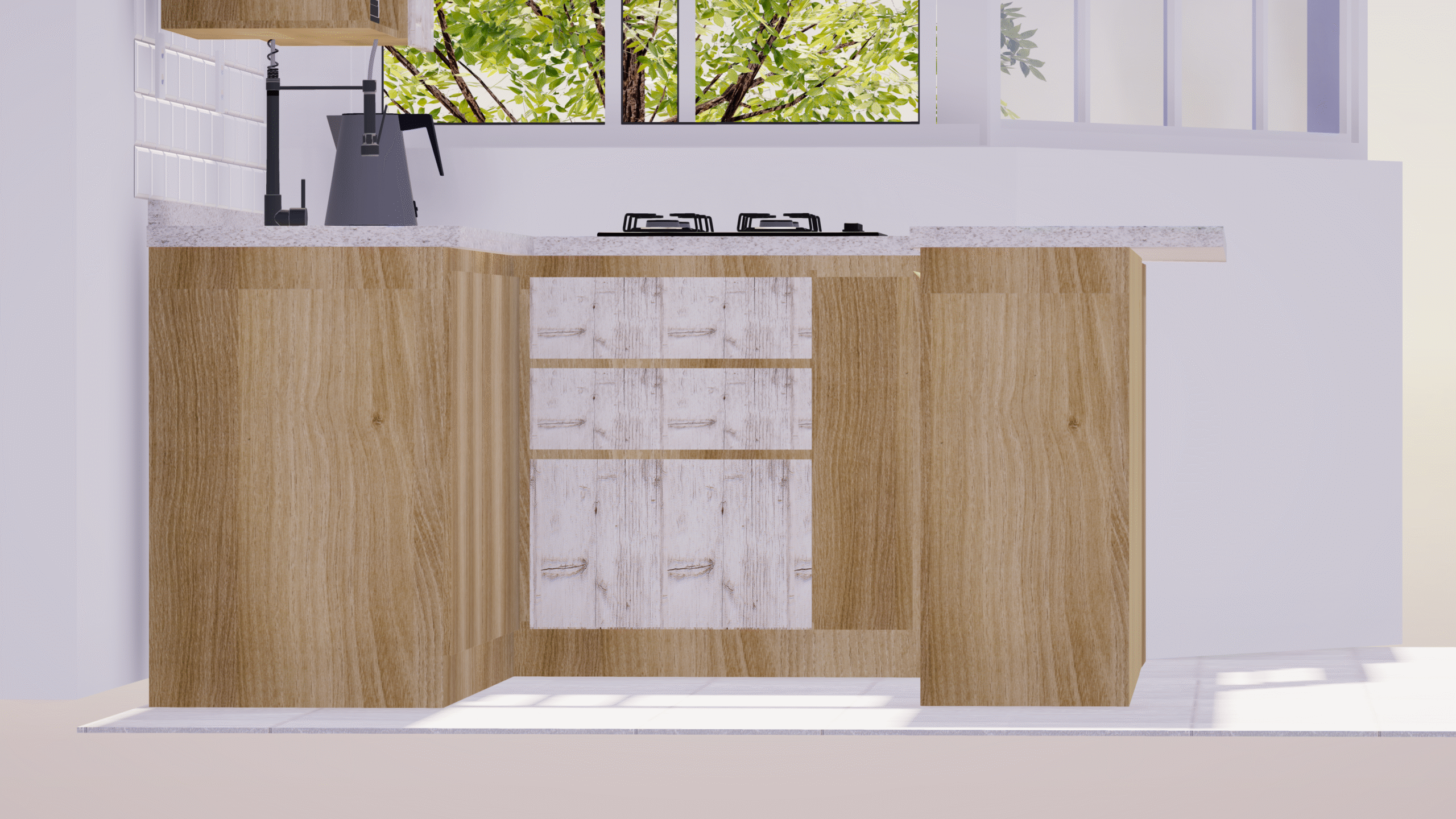 Seguindo inspirações do estilo escandinavo, optamos por pátina branca em algumas fachadas, trazendo leveza ao conjunto.
